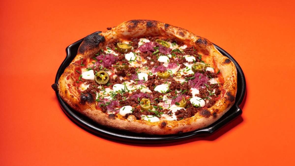 Trintų pomidorų padažas, mozzarella, chorizo, marinuoti jalapenai, raudonas svogūnas