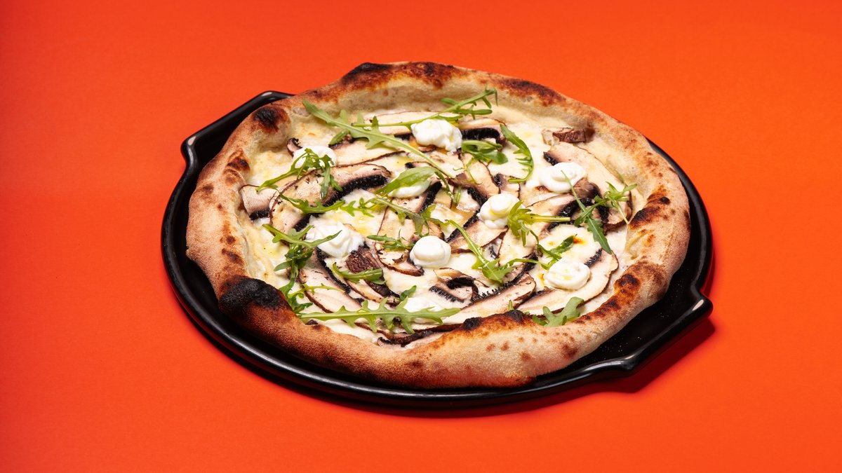 Mozzarella sūris, trumų-grietinėlės padažas, portobello grybai, rikotos sūris, trumų aliejus, rukola