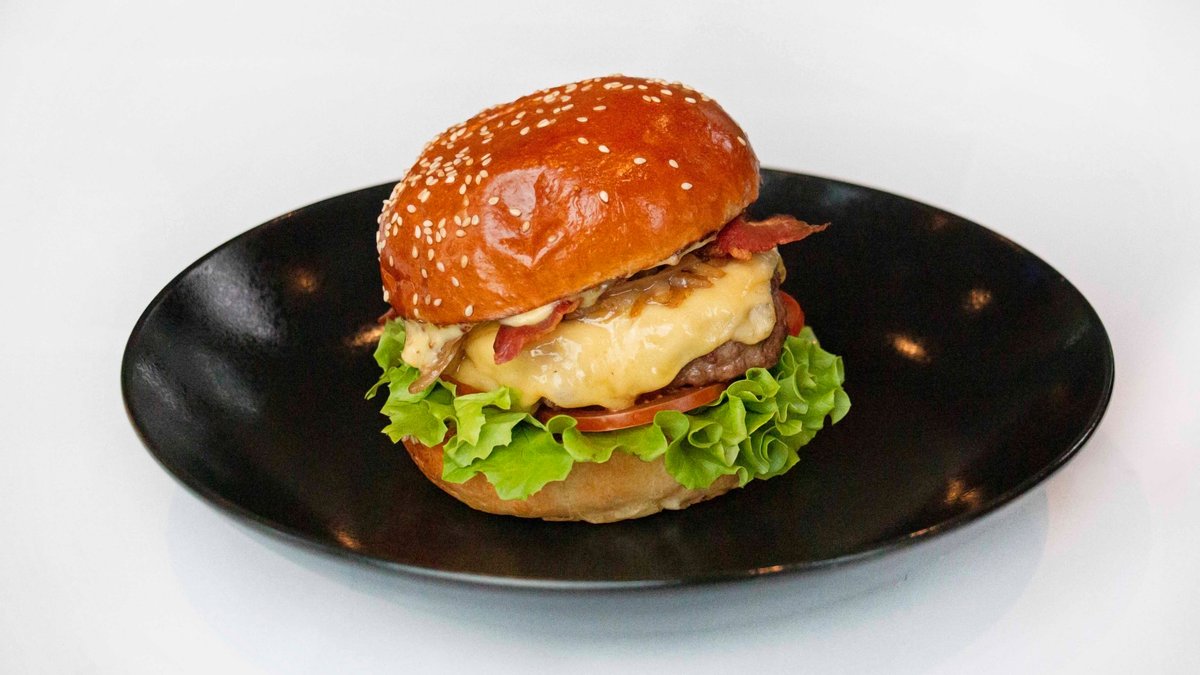 Brandintos jautienos maltinis, brioche bandelė, šoninė, naminis Aioli padažas, sūris, karamelizuoti svogūnai, romaninės salotos, pomidorai, marinuoti agurkėliai