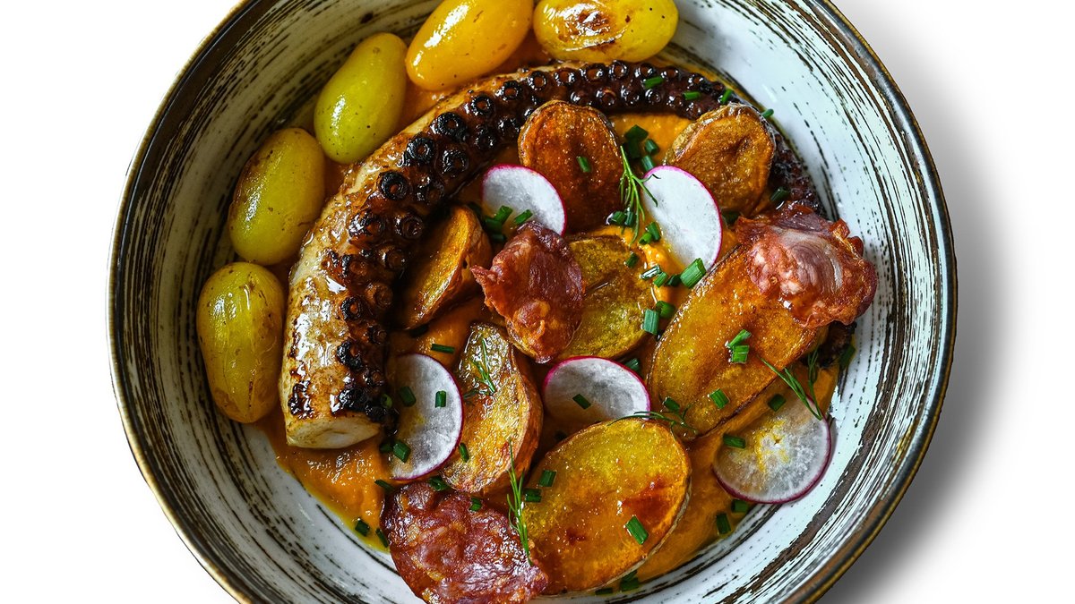 Mūsų virtas čiuptuvas su bulvių šimtalapiu, „Chorizo“ padažu ir daržovėmis