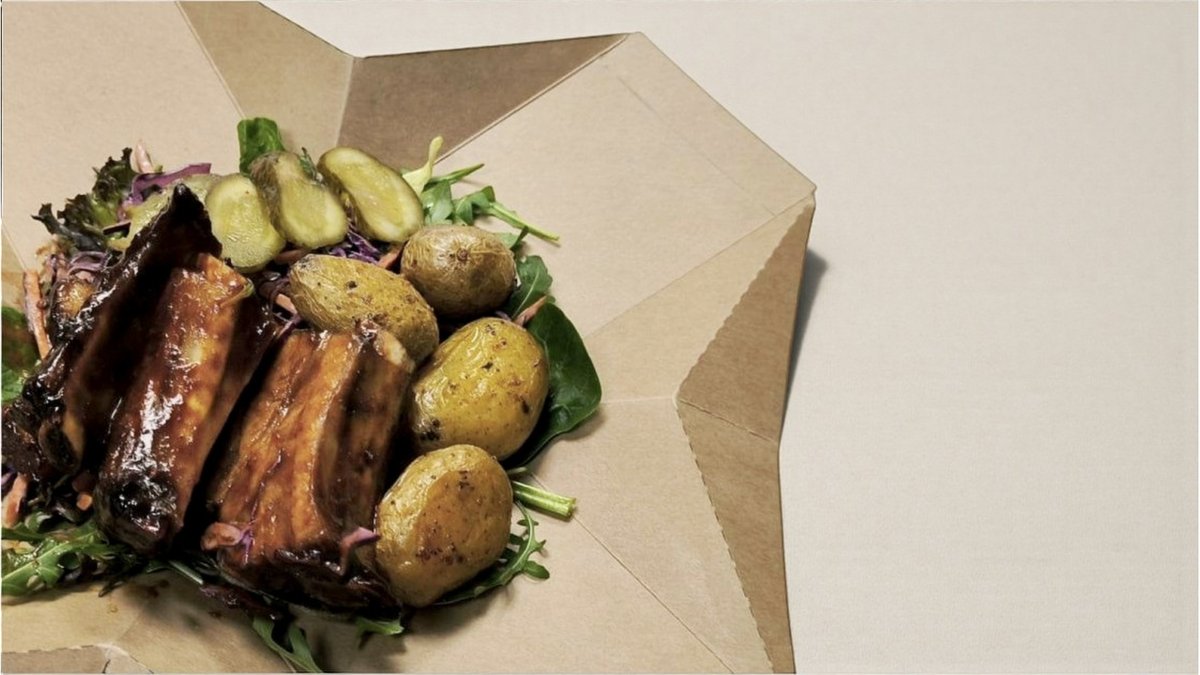 Kepti šonkauliai, coleslaw salotos, salotų asorti, keptos bulvytės, raugintas agurkas, bbq padažas