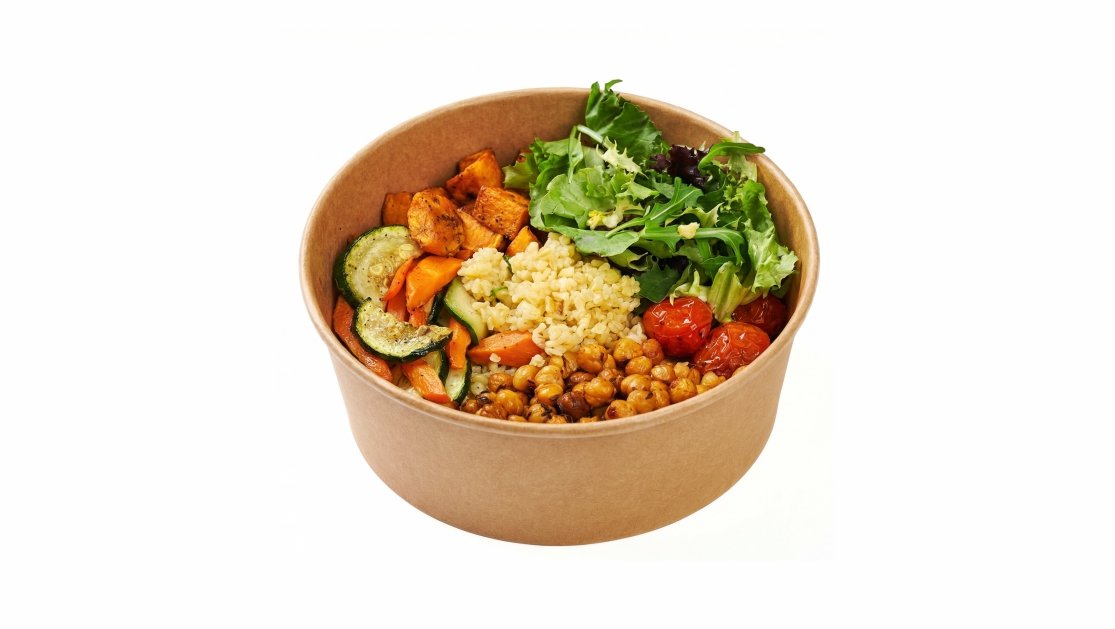 Kepti avinžirniai, keptos daržovės (batatai, vyšniniai pomidorai, morka, cukinija), salotų miksas, bulguro kruopos, prieskoniai