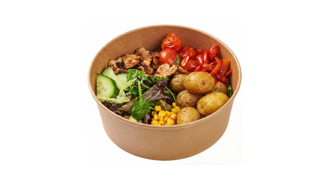 Šiltas vištienos bowl su prancūziškomis bulvytėmis ir keptomis daržovėmis