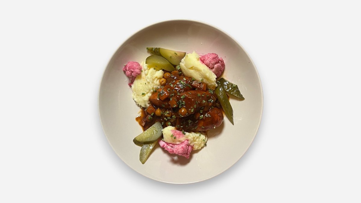 Naminės kiaulienos dešrelės, bulvių piurė, fermentuotos daržovės