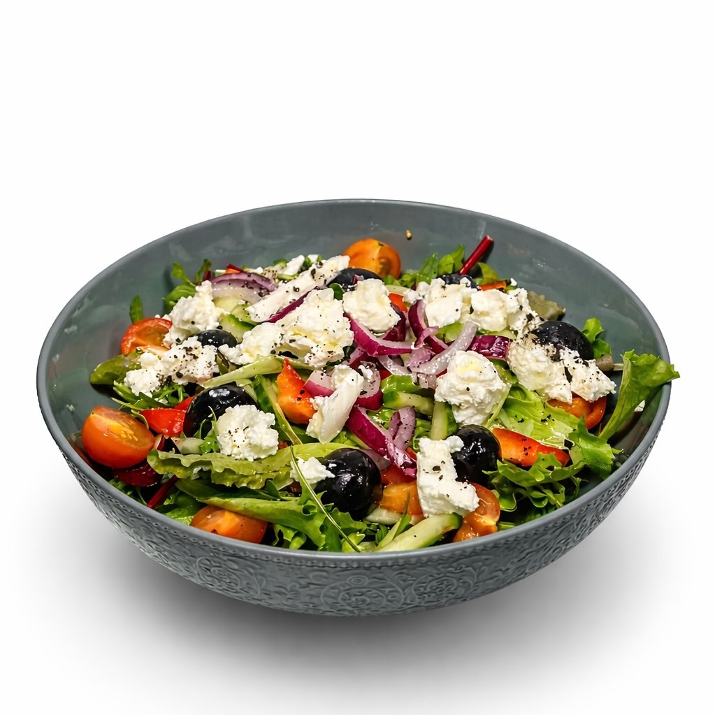 Pomidorai, agurkai, feta suris, salotų mišinys, svogūnai, alyvuogės, alyvuogiu aliejus, citrininis padazas.