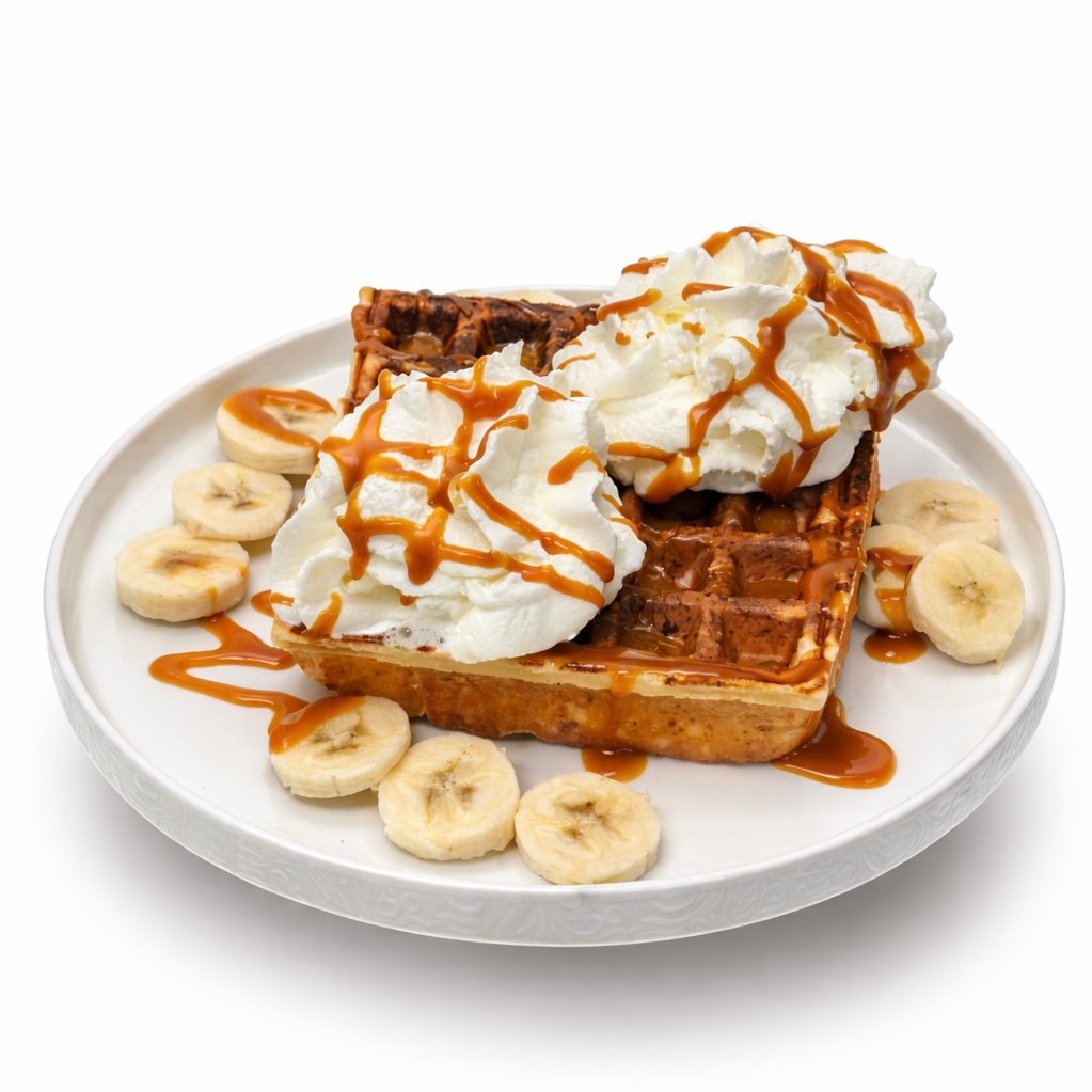Varškės vafliai su karamele, bananais ir plakta grietinėle
