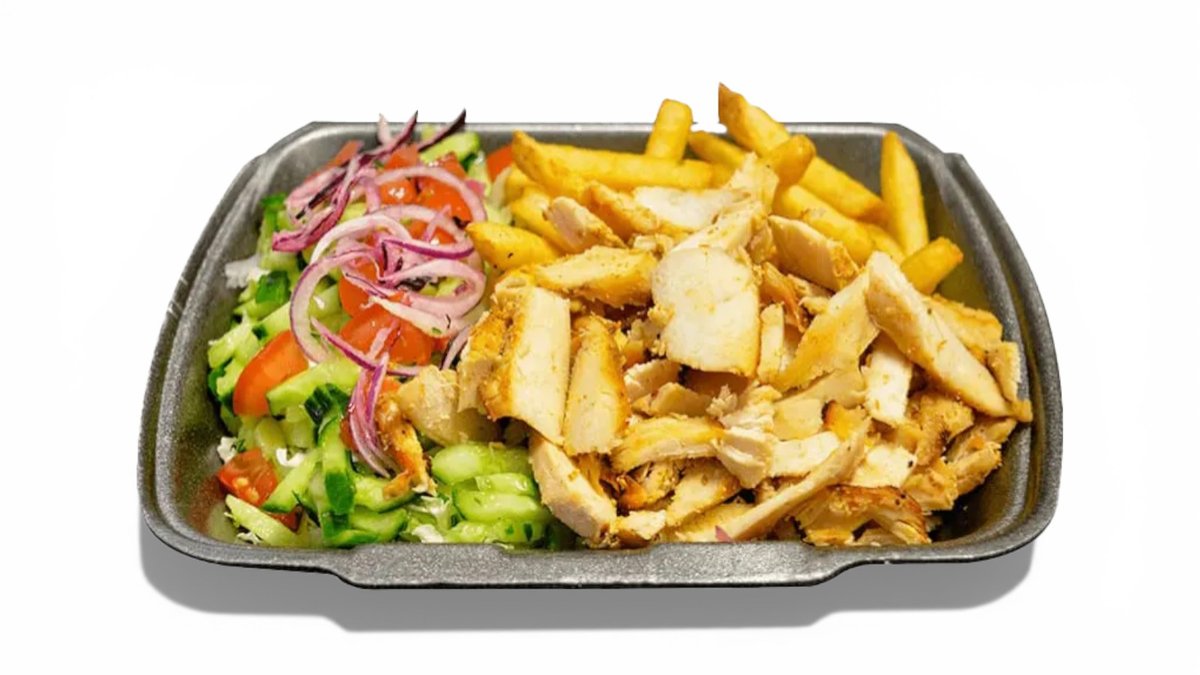 Vištiena (Halal), gruzdintos bulvytės, pomidorai, šv.agurkai, marinuoti agurkai, mėlynieji svogūnai, kopūstai, pasirinktas padažas (indelyje)