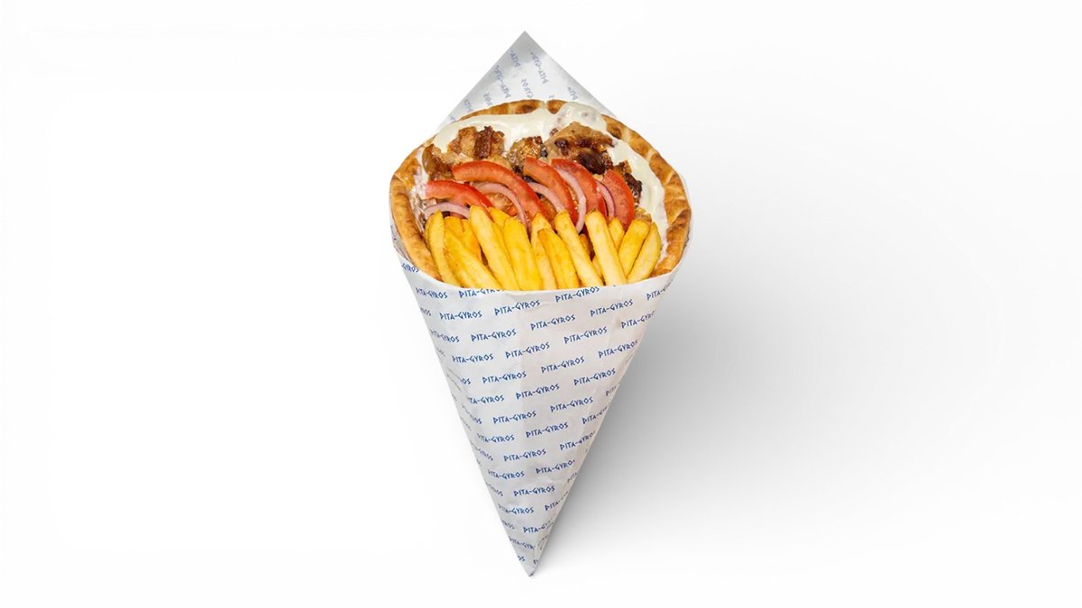 Gyros pita, gruzdintos bulvytės, pasirinktas padažas bulvytėms ir pilstomas gėrimas 300 ml arba Cappy sultys 330 ml