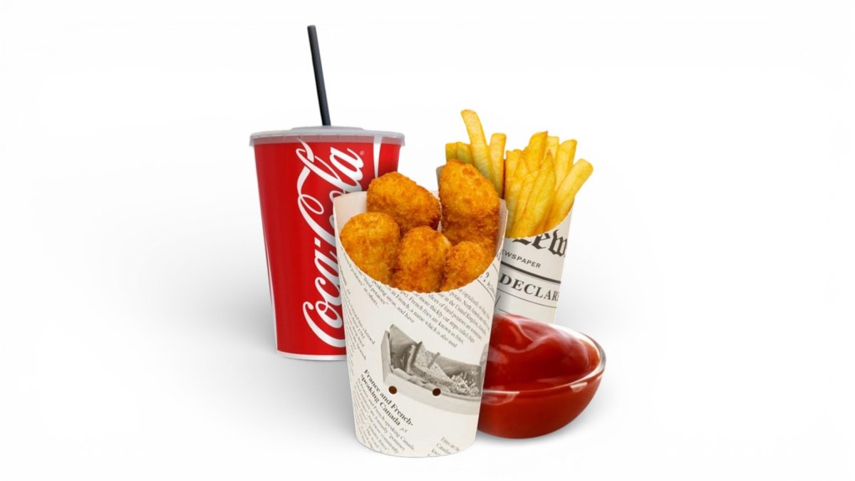 Vištienos kepsneliai, gruzdintos bulvytės, pasirinktas padažas bulvytėms ir pilstomas gėrimas 400 ml arba Cappy sultys 330 ml