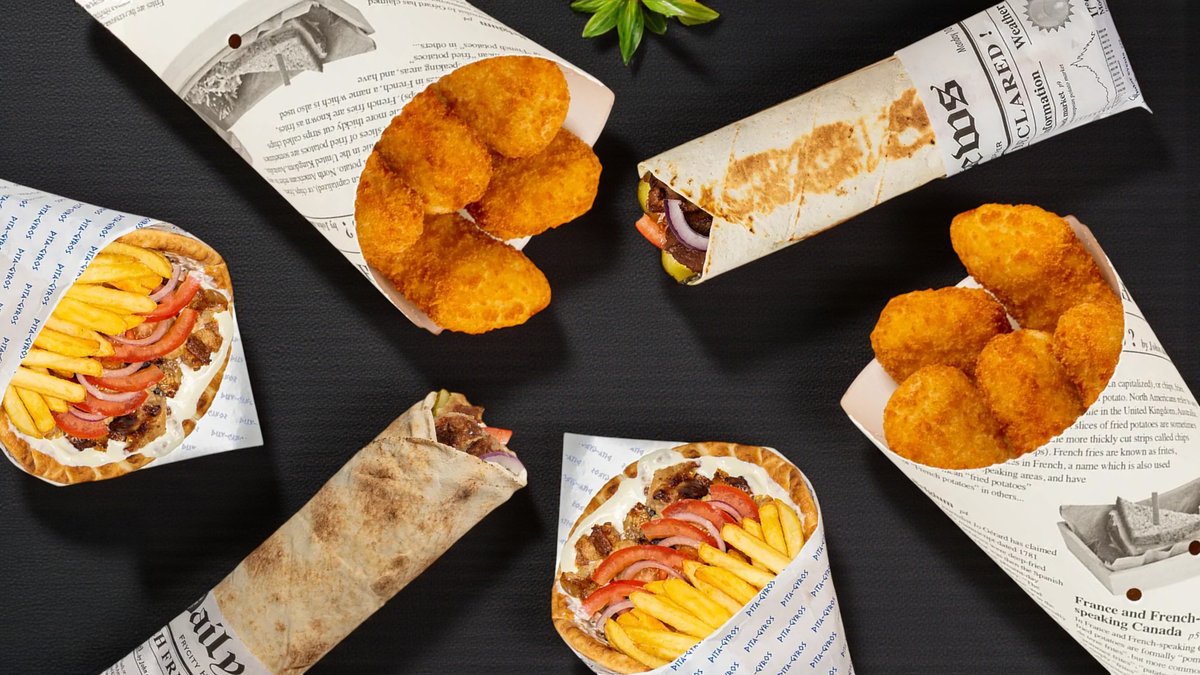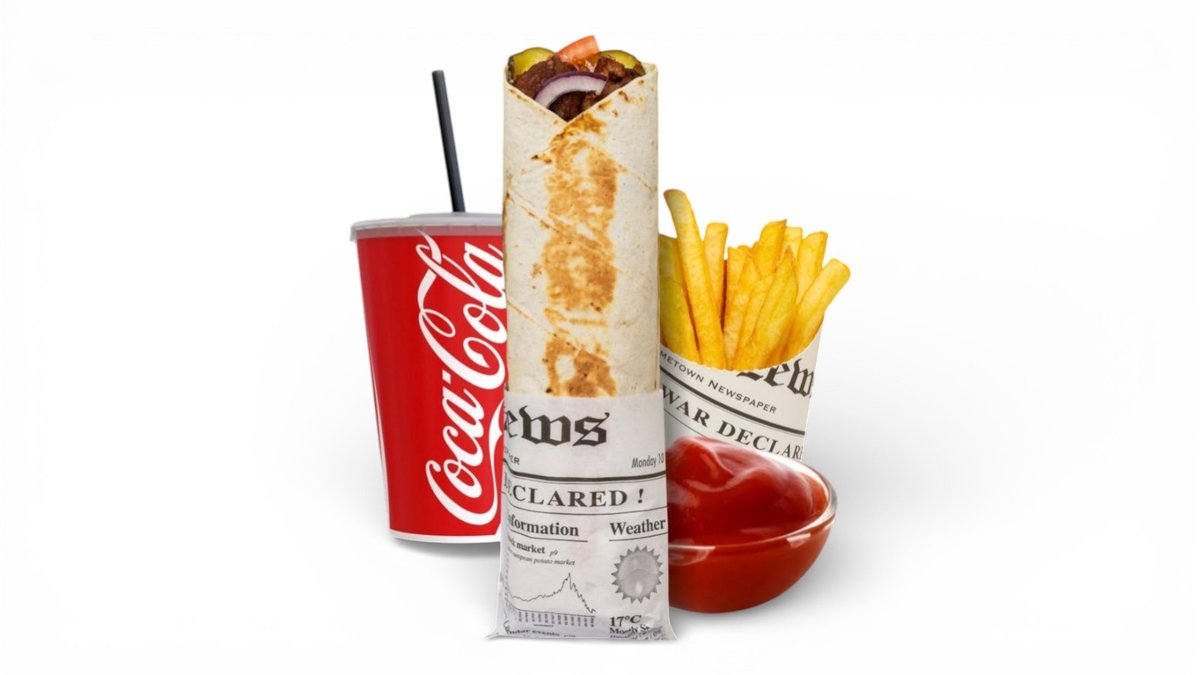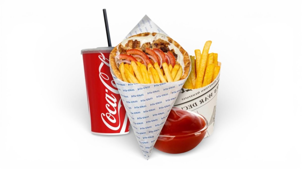 Gyros pita, gruzdintos bulvytės, pasirinktas padažas bulvytėms ir pilstomas gėrimas 500 ml arba Cappy sultys 330 ml