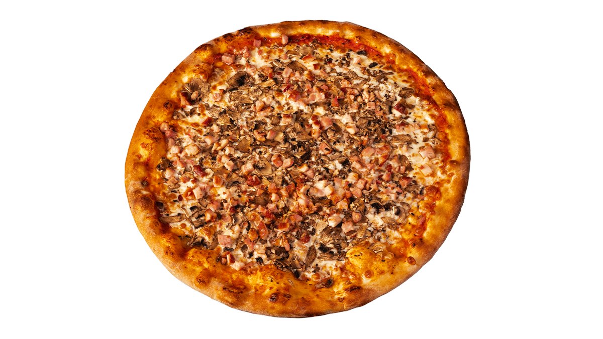 Pomidorų padažas, mocarela, rūkytas kiaulienos kumpelis, pievagrybiai, marinuoti agurkėliai
