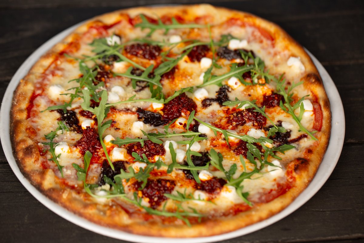 Mocarela, Nduja dešra, ožkos ir Džiugo sūriai, karamelizuoti svogūnai, rukola, pomidorų padažas