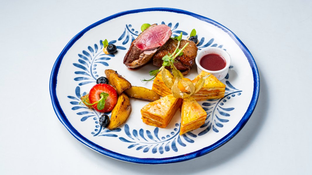 Kepta anties krūtinėlė su morkų gratinu, karamelizuotais obuoliais, serbentų-apelsinų padažu. Iškepimo lygis-,,medium''