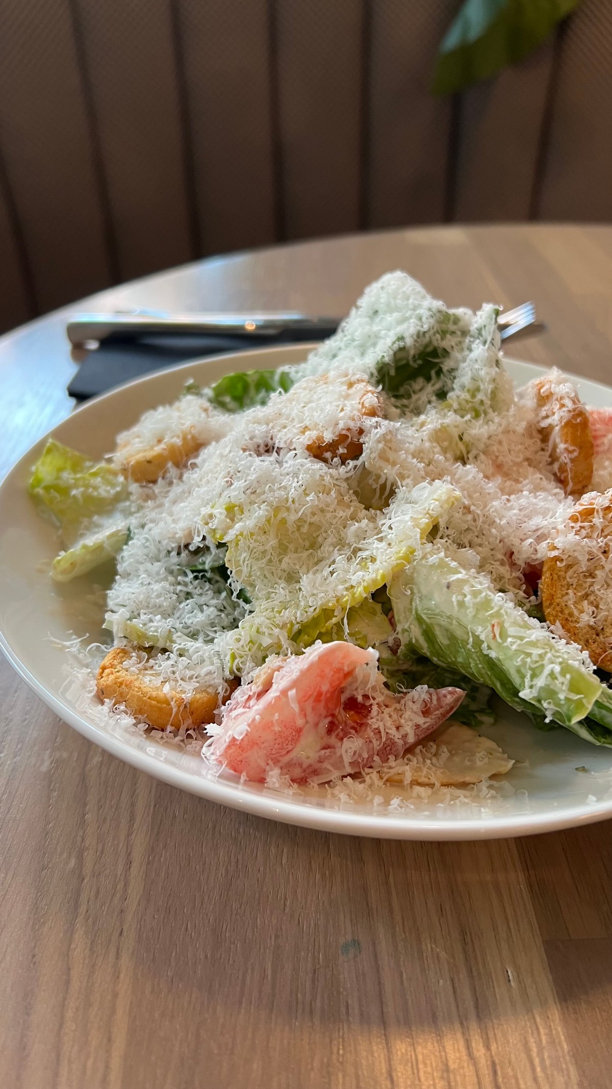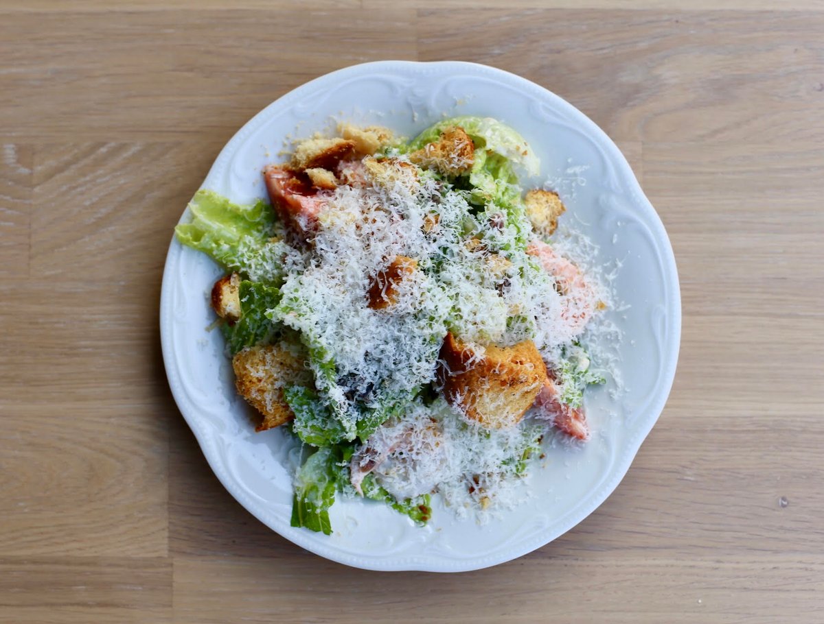 Klasikinės cezario salotos su tigrinėmis krevetėmis.