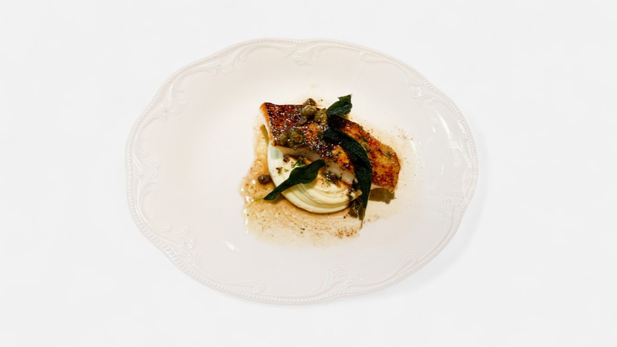 Oto filė su bulvių piure, brokoliais, žirnelių ankštimis ir balto vyno padažu