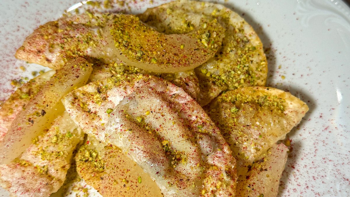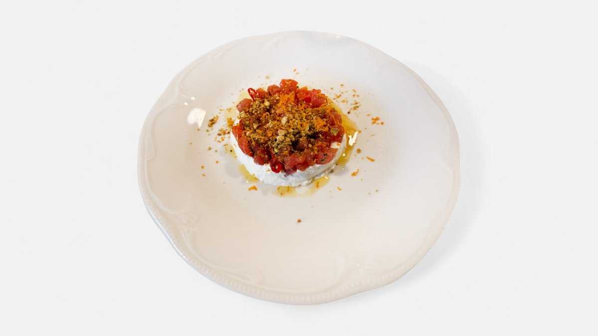 Tuno tartaras su Stracciatella sūriu pagardintas pistacijomis ir apelsininiu aliejumi
