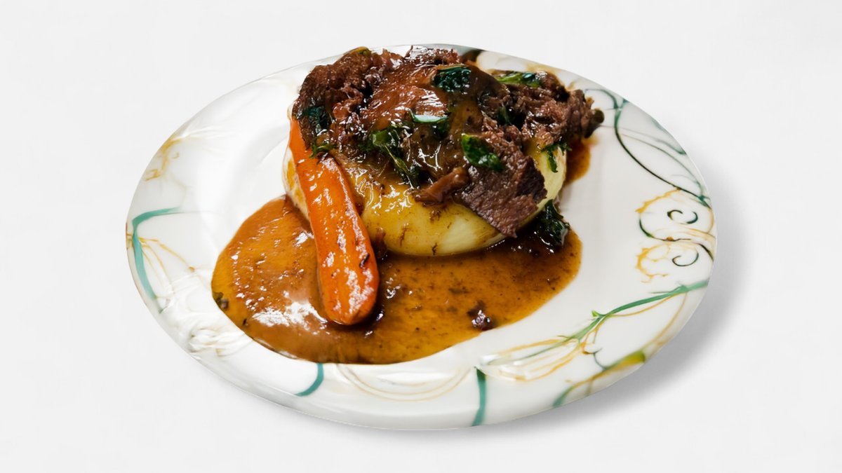Jautienos žandai su batatais ir trumų-raudonojo vyno padažu