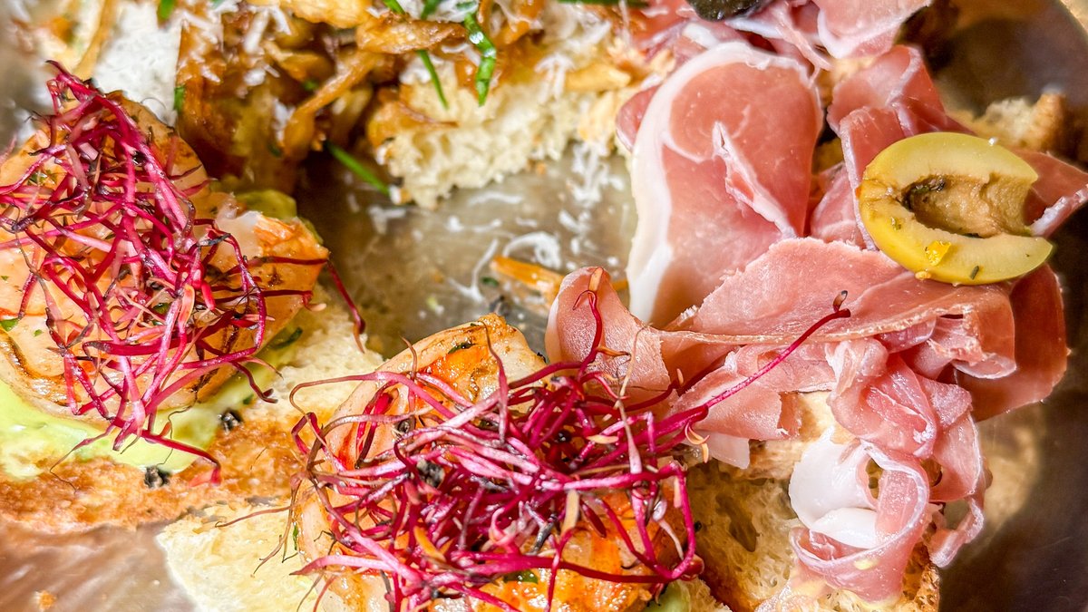 Brusketų rinkinys 6 vnt. : keptos krevetės, gvakamolė su kreivabudėmis ir parmezanu su vytintu kumpiu, džiovintais pomidorais ir alyvuogėmis