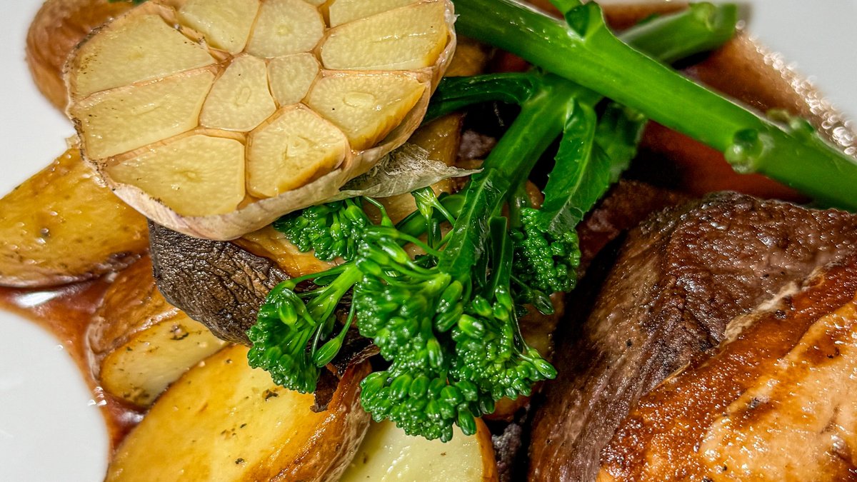 Jautienos išpjovos steikas su mini bulvytėmis, brokoliais, foie gras, grybų ir raudono vyno padažu. Svarbu - kepsnys gali perkepti, priklausomai nuo kelionės trukmės.