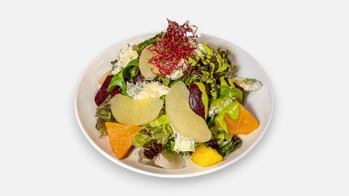 Lapinės salotos su burokėliais, gorgonzola ir kriaušėmis