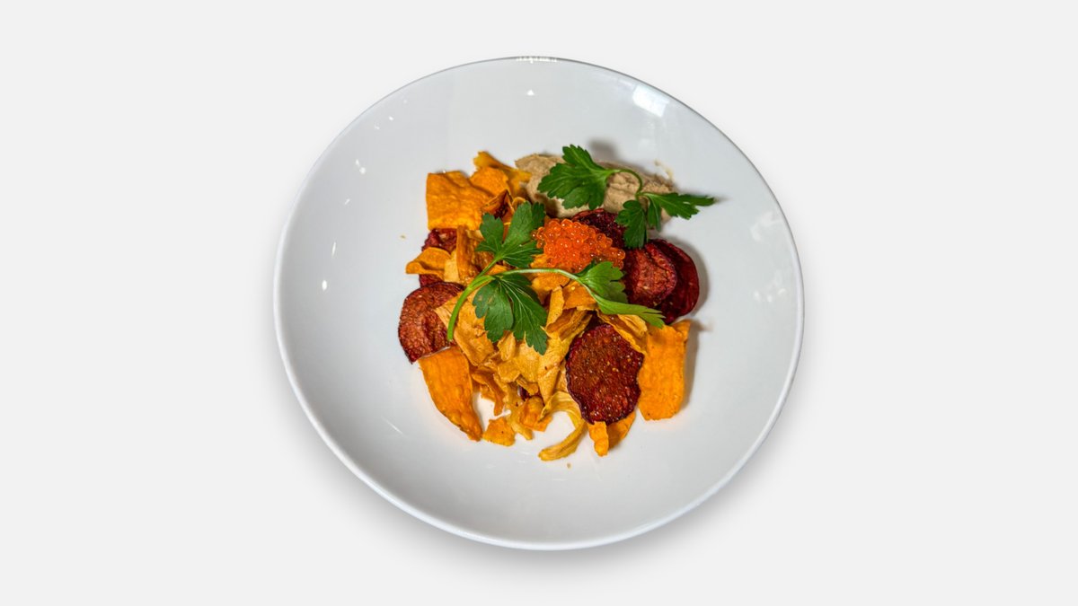 Anties kepenėlių paštetas su raudonaisiais ikrais, patiekiamas su traškučiais.
