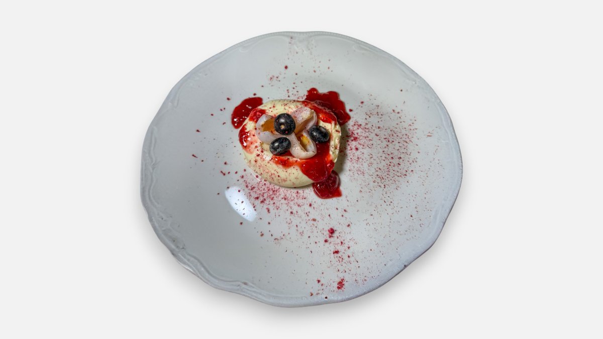 Baltojo šokolado ganašas su aviečių tyre ir ličiais