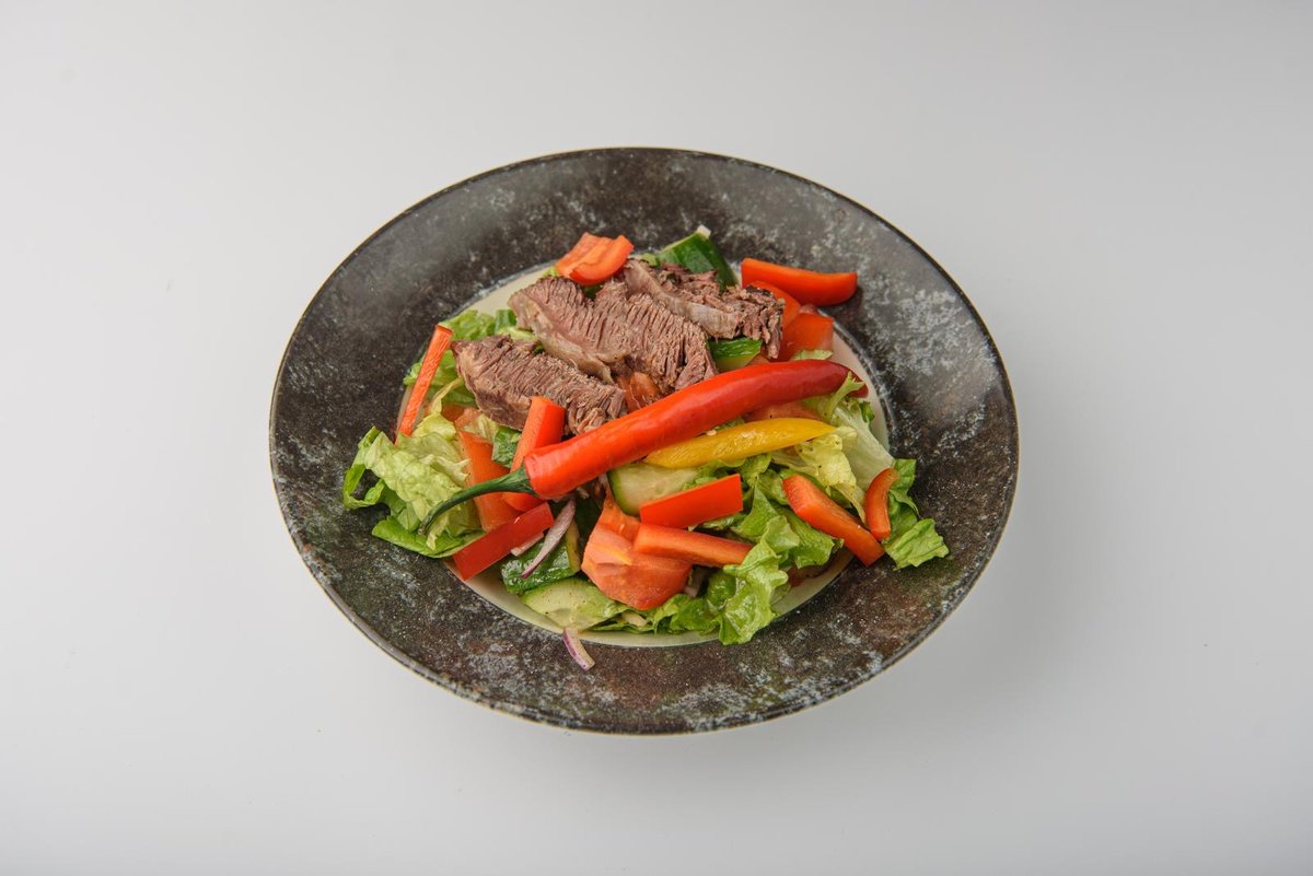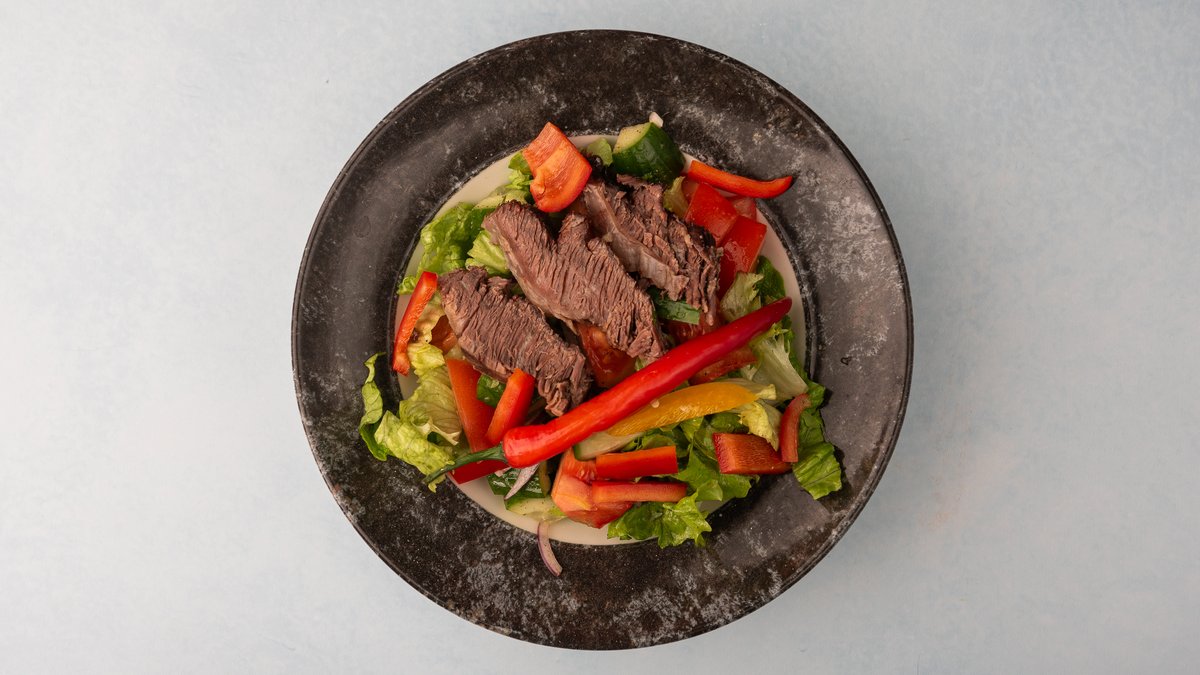 Sultinga jautiena, sunokęs pomidoras, švelnus baklažanas, kvapni kalendra, traškus salotų mišinys ir pikantiškas sojos padažas – Rytietiškas skonių džiazas, 200 g.