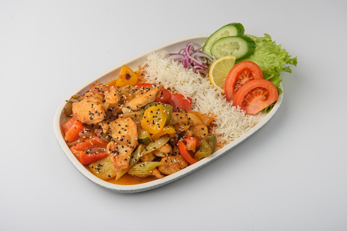 Sultinga vištienos filė, aromatingi kepti svogūnai, gaivūs brokoliai, aitrūs pipirai ir traškūs šparagai – patiekiama su puriais ryžiais bei šviežiomis daržovėmis, 200 g.
