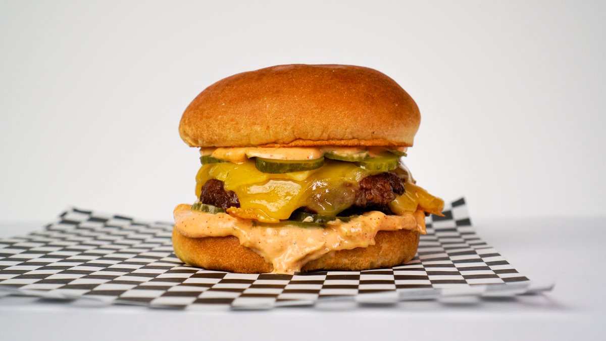 Bandelė, 2x jautienos paplotėliai, čederio sūris, marinuoti agurkėliai, agurkėlių majonezas.