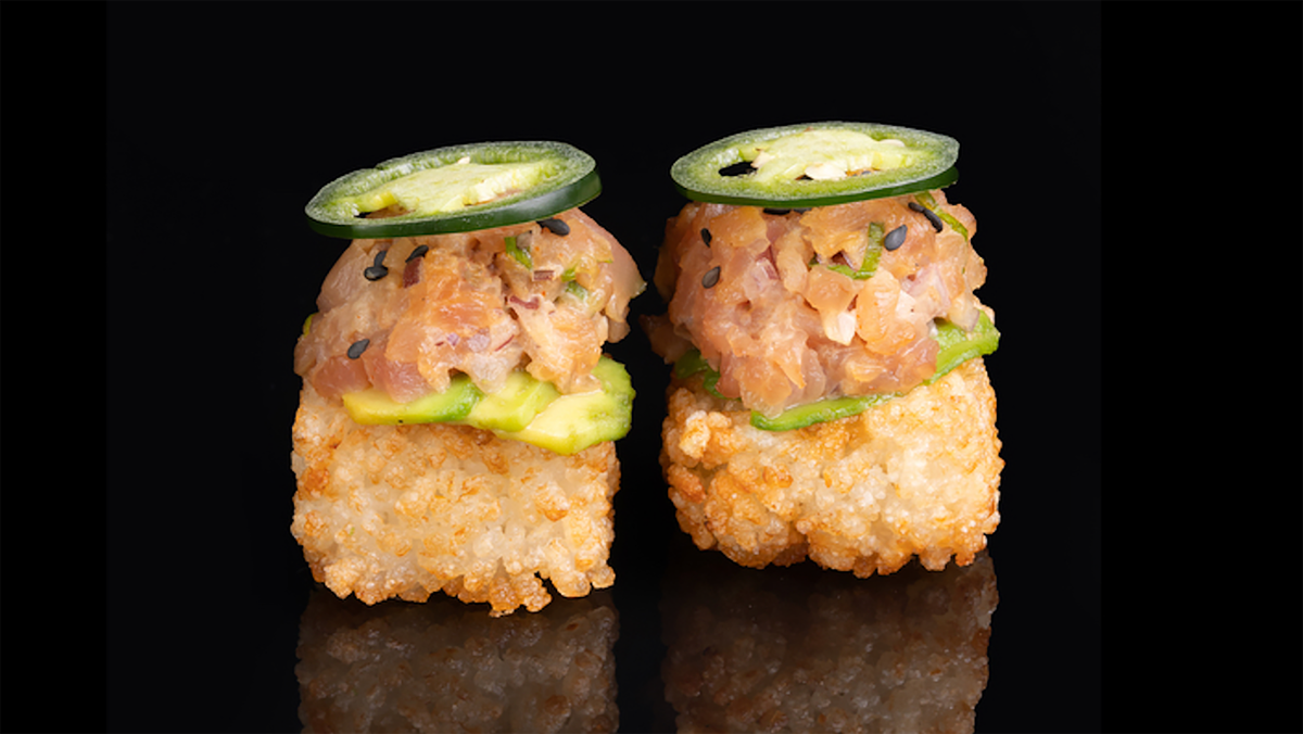 Lašiša, tobiko ikrai, avokadas, tempura traškučiai, kremas, sriracha padažas