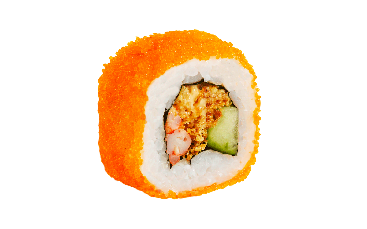 Ungurys, krabų lazdelės, masago ikrai, tempuros traškučiai, majonezas, teriyaki padažas, sezamų sėklos. 8 vnt.