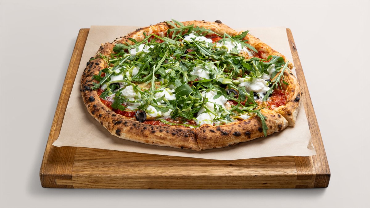 Pomidorų padažas, artišokai, kalamata alyvuogės, kedrinės pinijos, burrata sūris, parmezanas, bazilikų pesto, rukola