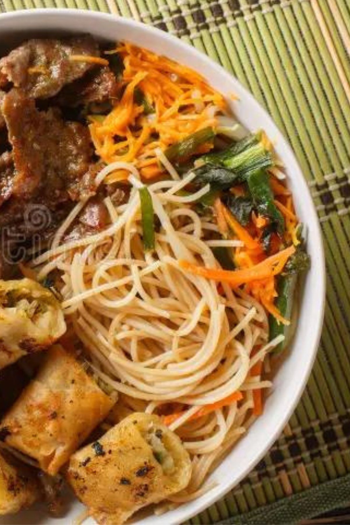 Salotos su ryžiu makaronais, kepinta jautiena, kiaulienos spring roll, marinuotais ridikais bei morkom, agurkais, riešutais, žuvies padažas