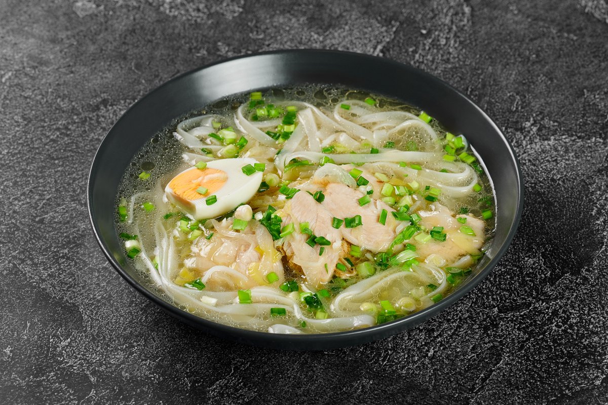 Vištiena, ryžių makaronai, svogūnai, svogūnų laiškai