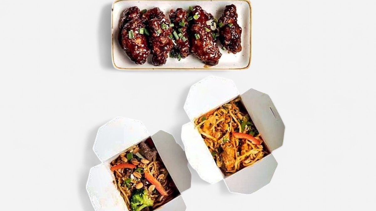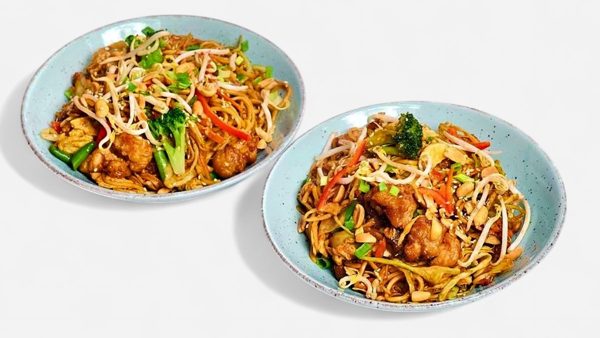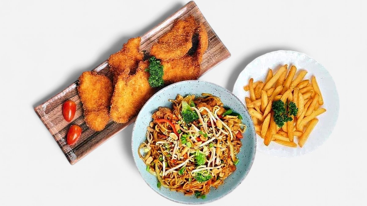 ~Kiaušinių makaronai su vištiena Bankoko kario padaže ~Kiaušinių makaronai su jautiena Teriyaki padaže ~ vištienos sparneliai BBQ padaže (7 vnt.) ~pavasario ritinėliai (3 vnt) ~vištienos juostelės (5 vnt) + bulvių skiltelės ~500 ml cola ~ 1x čili česnakinis majonezas ~ 1x saldus čili padažas