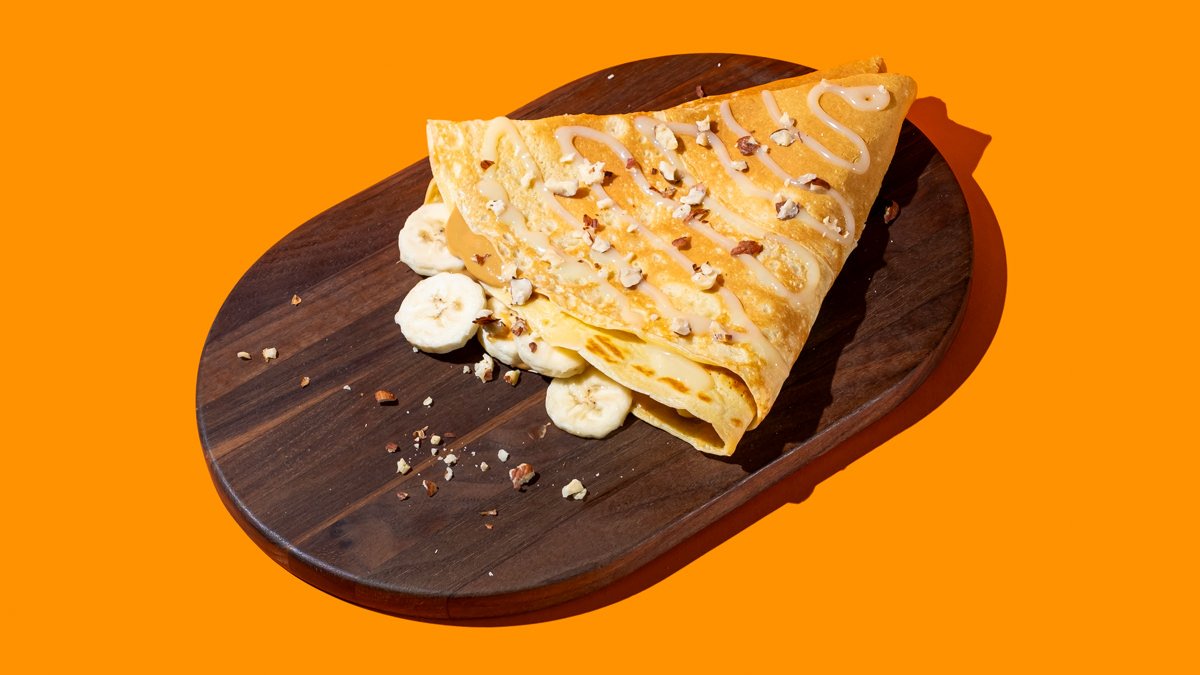 Gausiai įdarytas lietinis su riešutų sviesto kremu, bananu ir pekano riešutais
