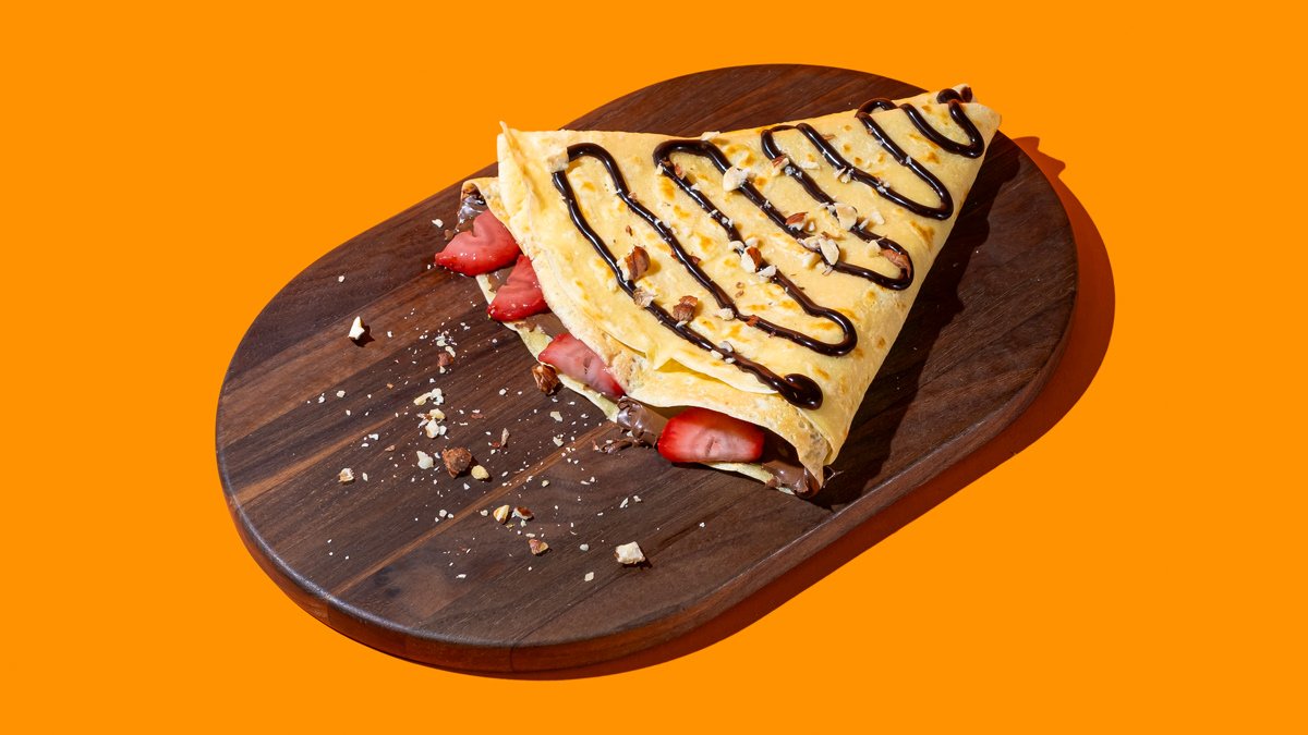 Gausiai įdarytas lietinis šokoladiniu kremu Nutella, braškėmis bei smulkintais lazdyno riešutais