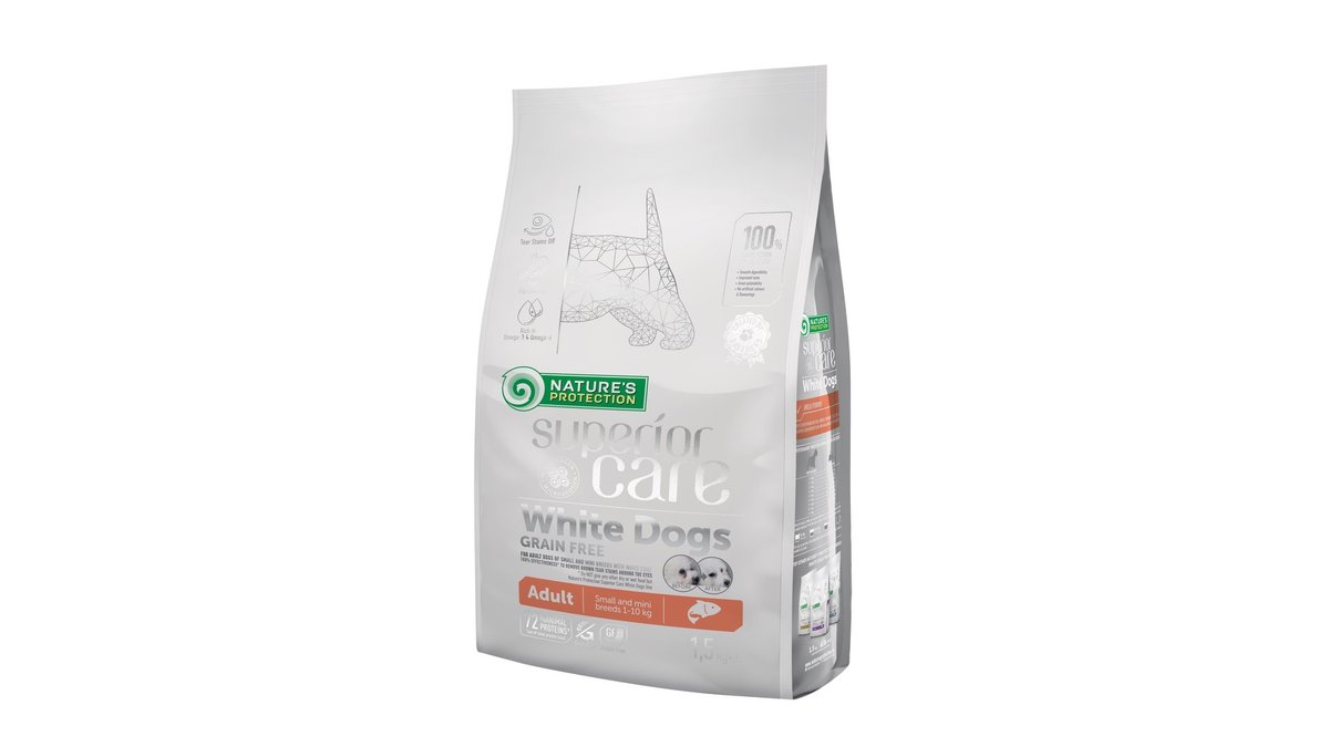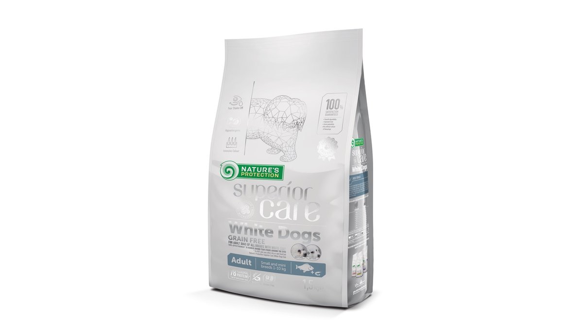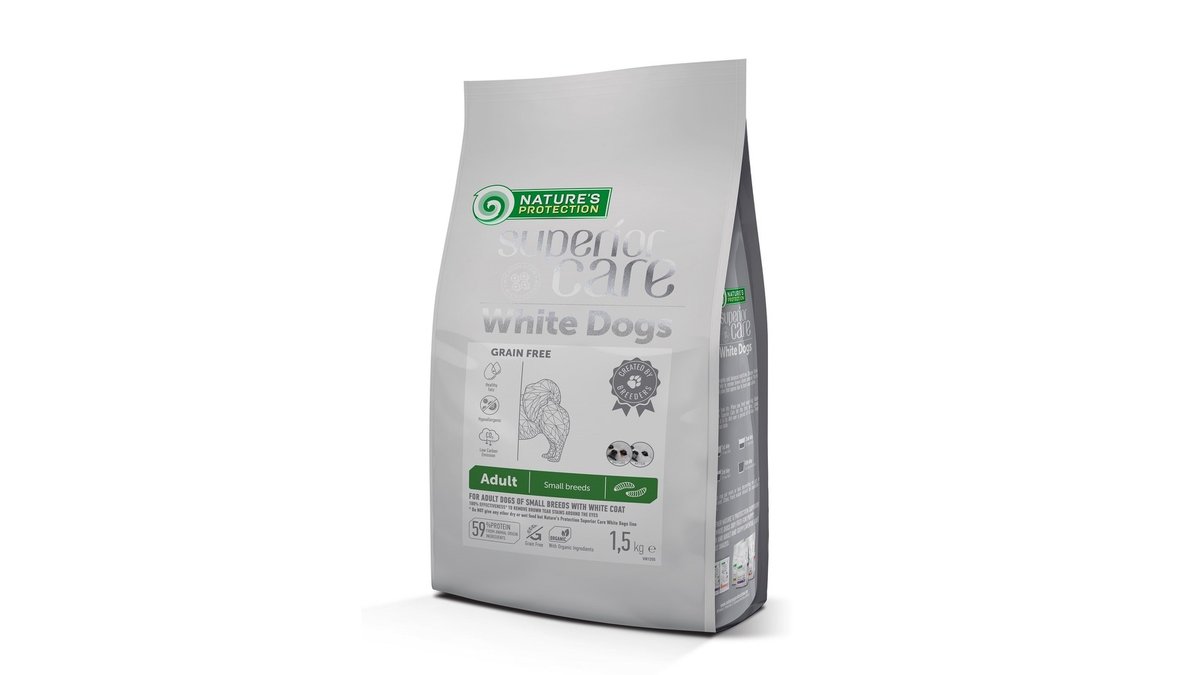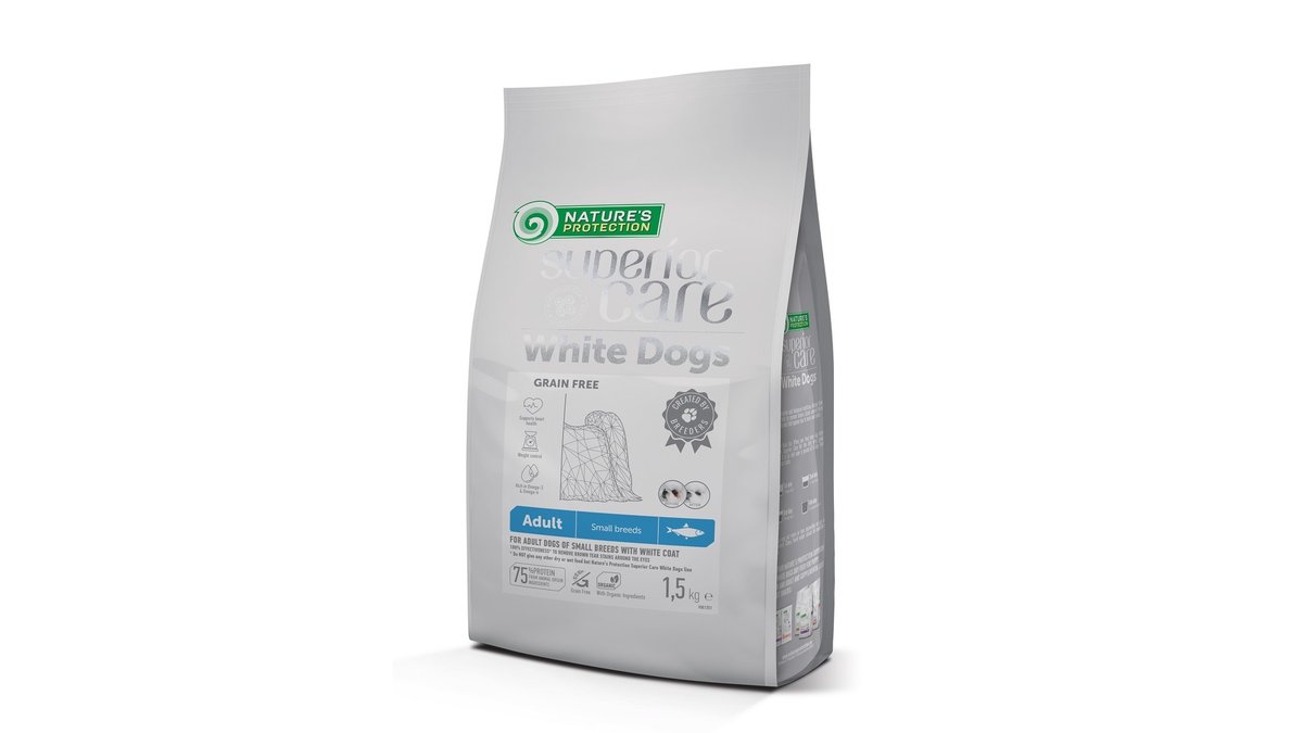 Nature's Protection Superior Care White Dog Grain Free with Herring Adult Small Breed, mažų veislių suaugusių baltakailių šunų sausas begrūdis pašaras su silke, 1,5 kg
