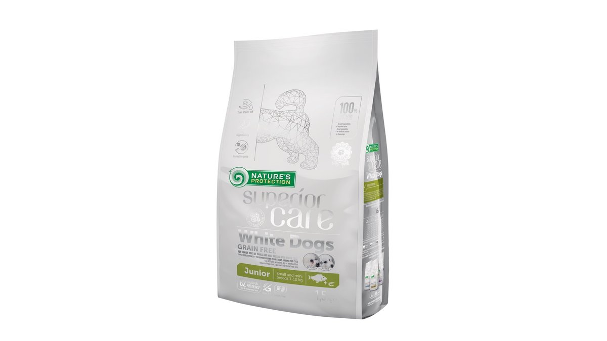 Nature's Protection Superior Care White Dogs Grain Free White Fish Junior Small and Mini Breeds 1,5 kg, mažų ir labai mažų veislių balto kailio jaunų šunų sausas begrūdis pašaras su balta žu