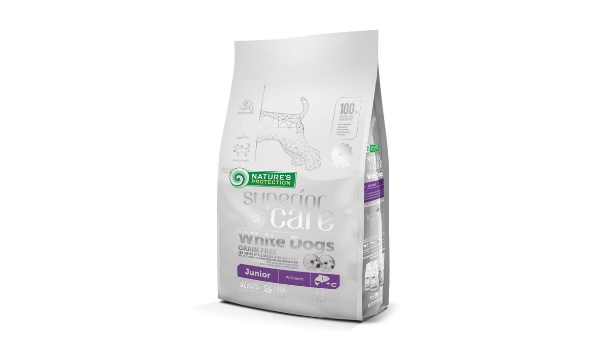 NATURE'S PROTECTION SUPERIOR CARE White Dogs Grain Free Salmon Junior All Breeds, visų veislių jaunų baltakailių šunų begrūdis sausas pašaras su lašiša, 1,5 kg