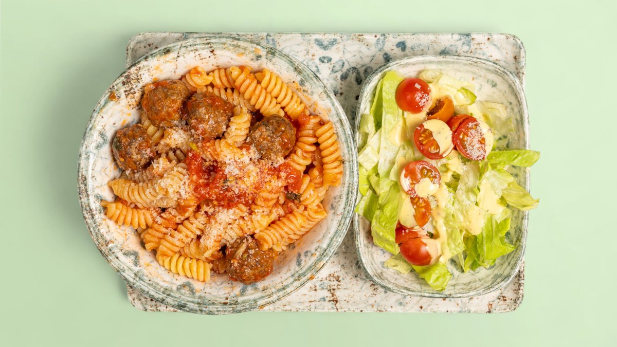 Fusilli pasta with meatballs in tomato sauce, topped with parmesan and served with a fresh salad of cherry tomatoes, cucumber, and lettuce.