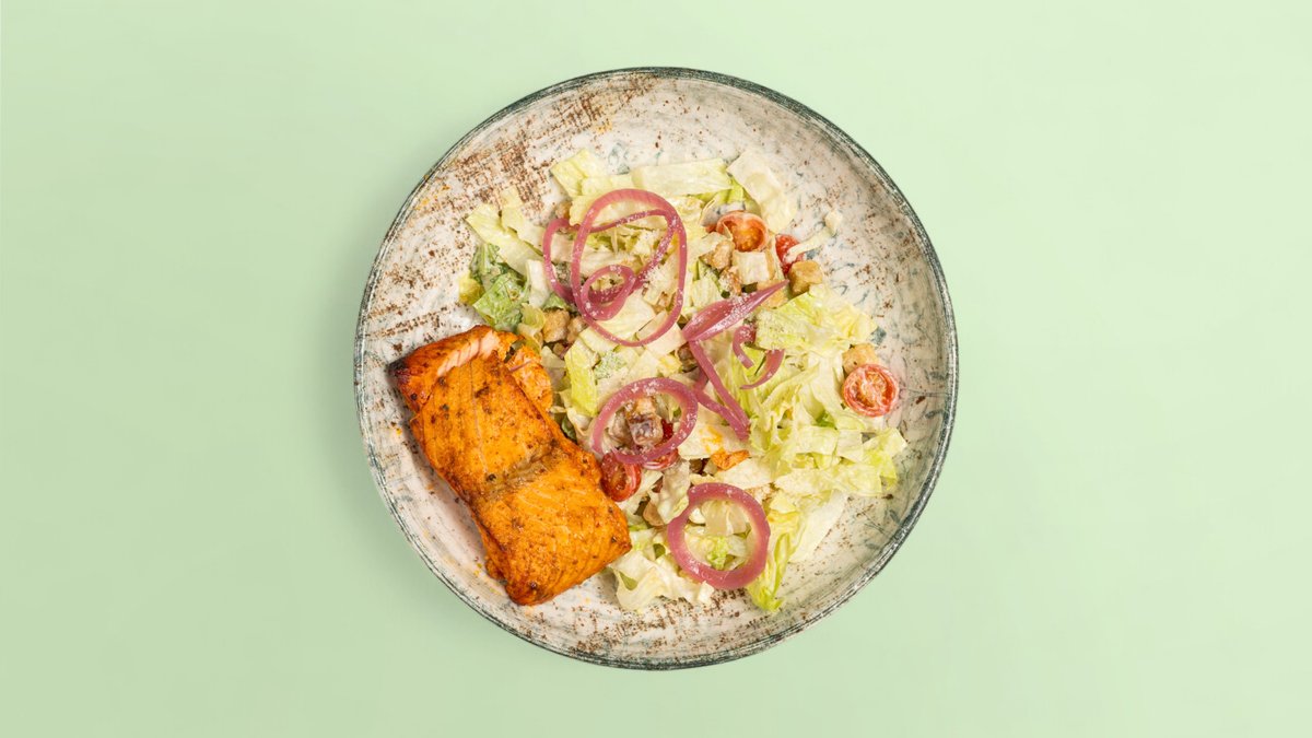 Romaine lettuce, crunchy croutons, parmesan shavings, cherry tomatoes, and Caesar dressing. With GRILLED SALMON SLICES
