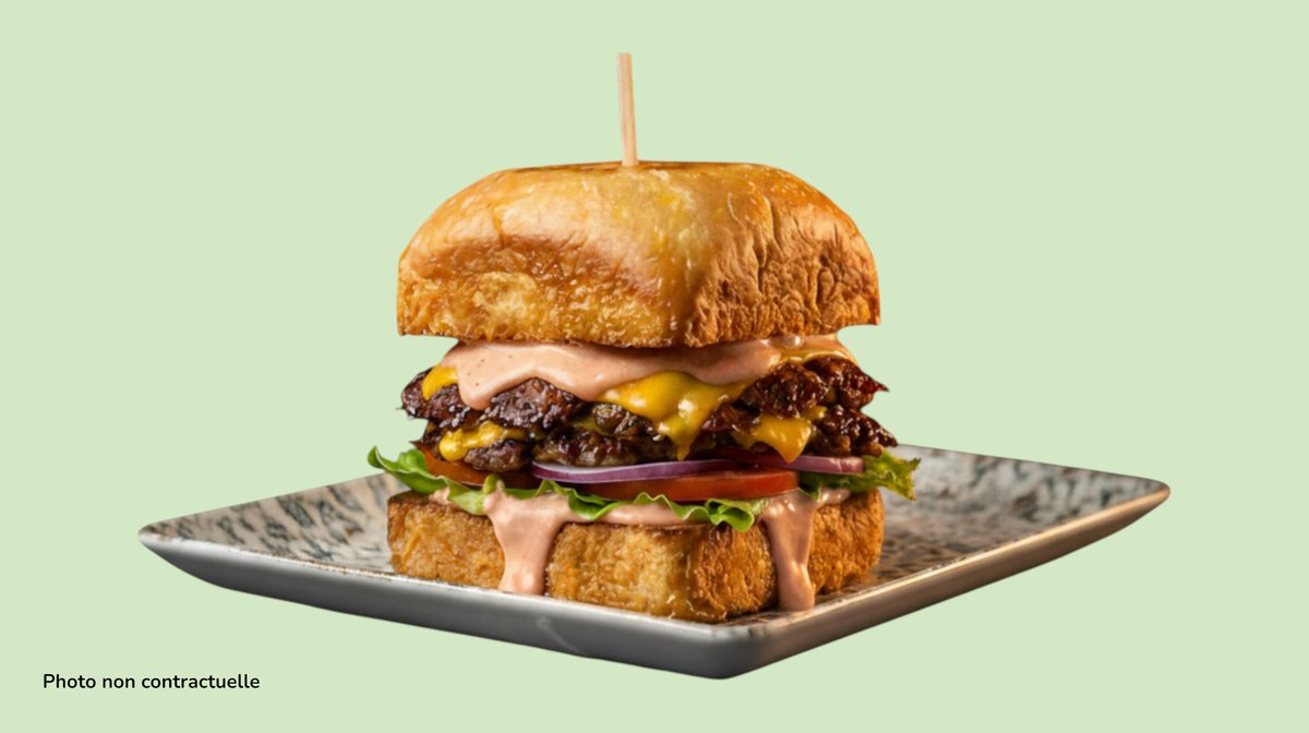 Brioche bun, smashed beef patty, lettuce, onion, tomato, cheddar cheese, pink sauce.