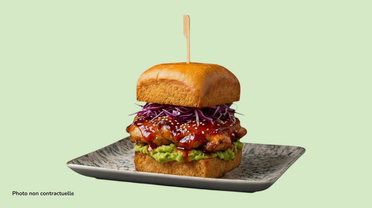 Brioche bun, grilled chicken thigh, guacamole, red cabbage, korean spicy sauce.