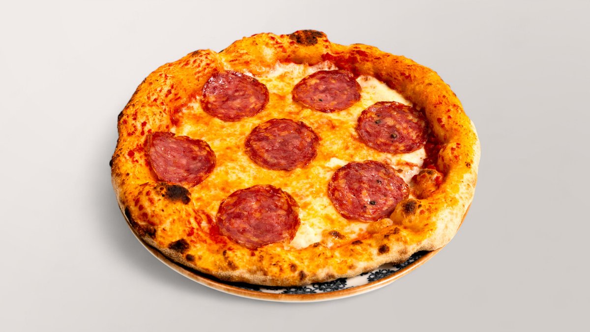 Tomate, mozzarella, salami doux & piquant, ricotta, épinards, double pâte à pizza