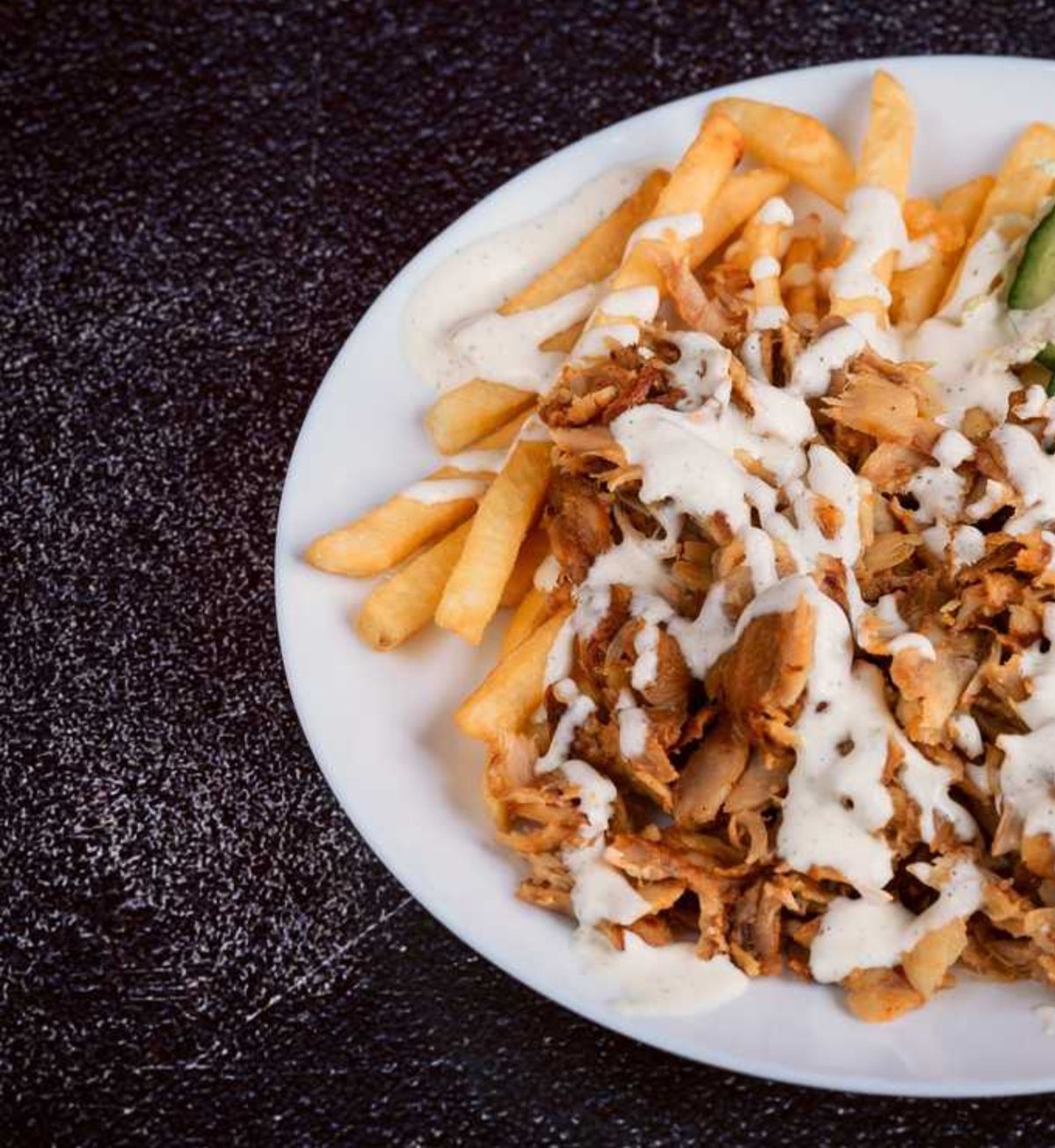 Vistas kebaba gaļa ar frī kartupeļiem, salātiem, mērci