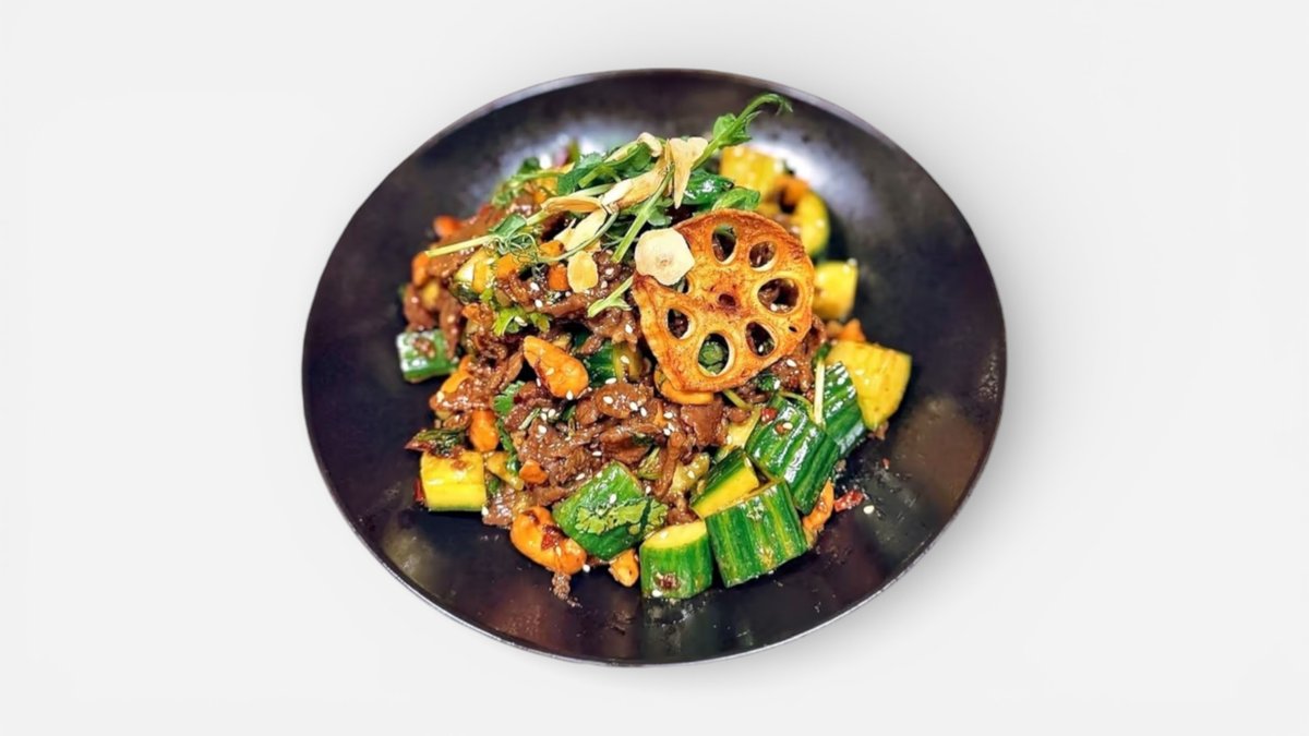 Liellopa gaļa, gurķis, paprika, sojas mērce, čili, zemesrieksti, sezama eļļa, koriandrs