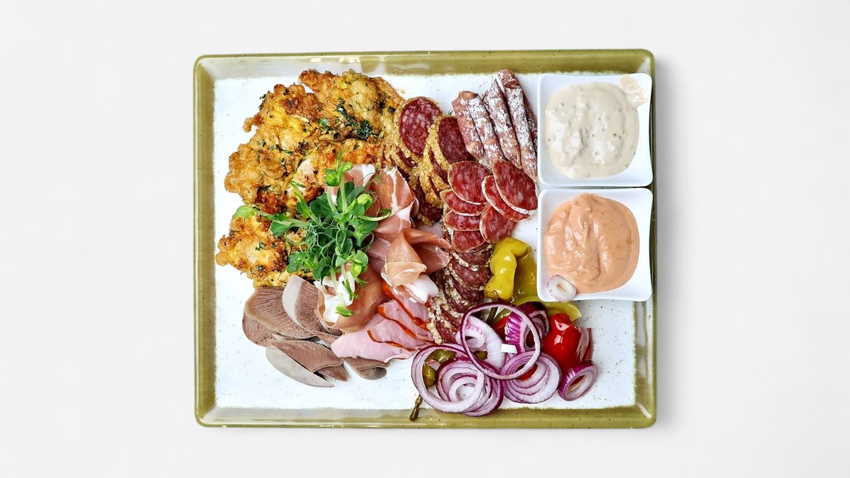 (liellopa mēle, kūpināts šķiņķis, ceptas cūkgaļas karbonādes, salami, cigārdesiņas, marinēti gurķīši, marinēti šampinjoni, steika mērce, sinepju mērce)