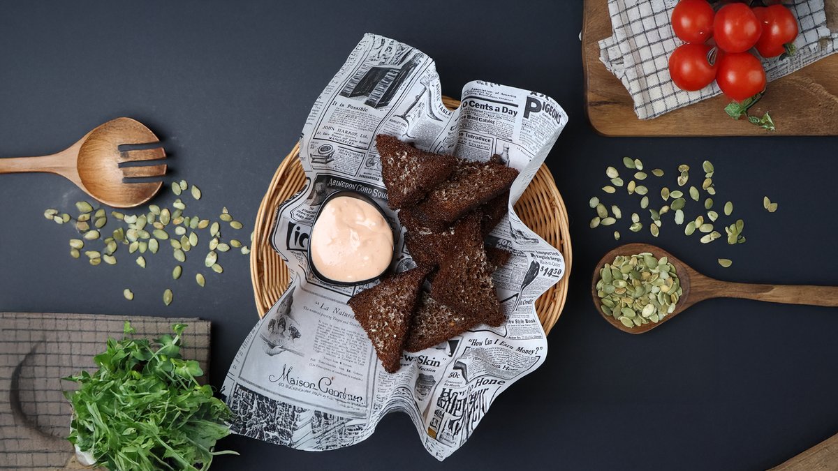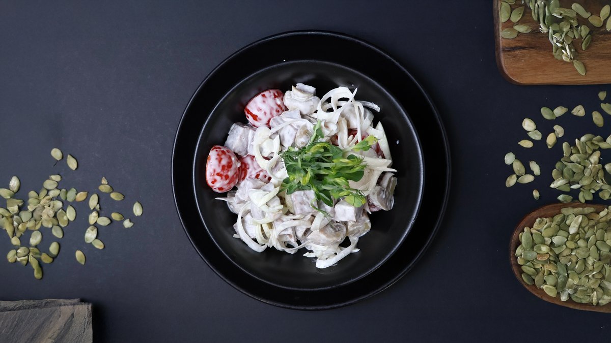 (olas, saldais krējums, šampinjoni, mārrutku - majonēzes mērce)