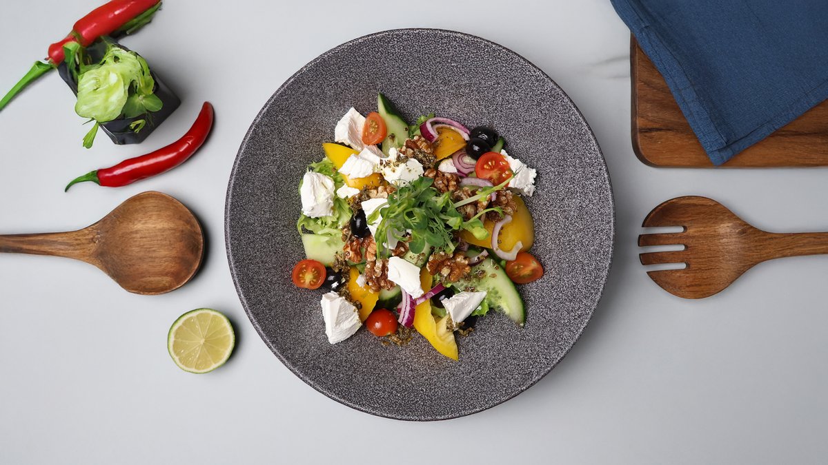 (fetas siers, olīvas, sīpoli, paprika, tomāti, gurķi, salātlapas, valrieksti,citronu – bazilika eļļas mērce)